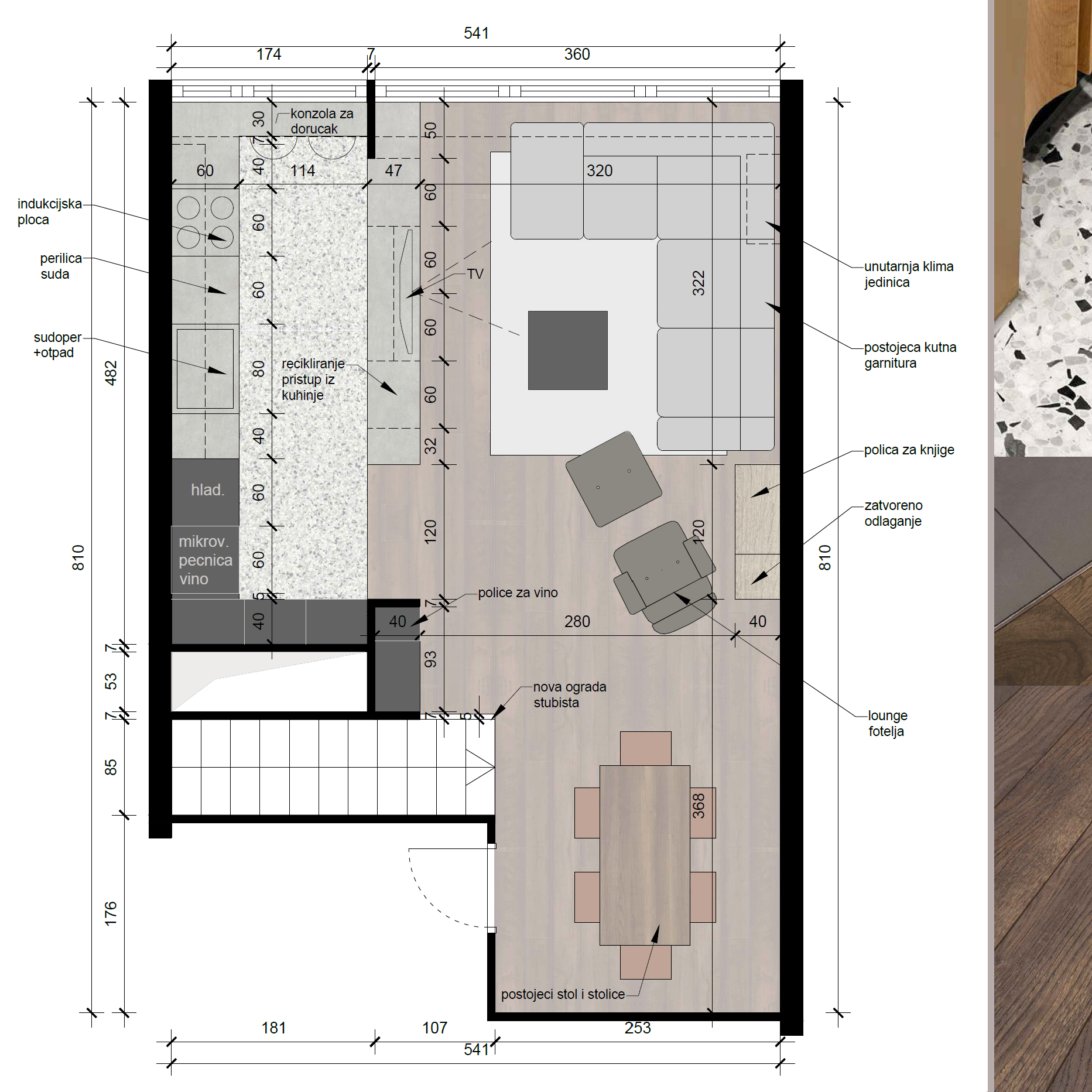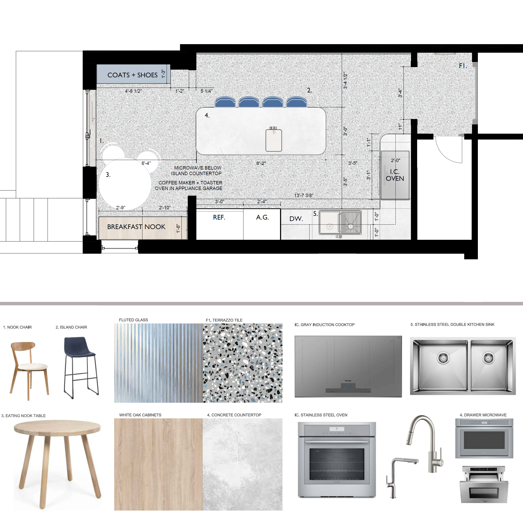 In partnership with Justin Loucks Architecture . A detailed floor plan and material selection for the kitchen and breakfast nook. White oak cabinetry, terrazzo tiles, and dark blue details are combined to create a modern and functional space, perfect for both cooking and gathering.