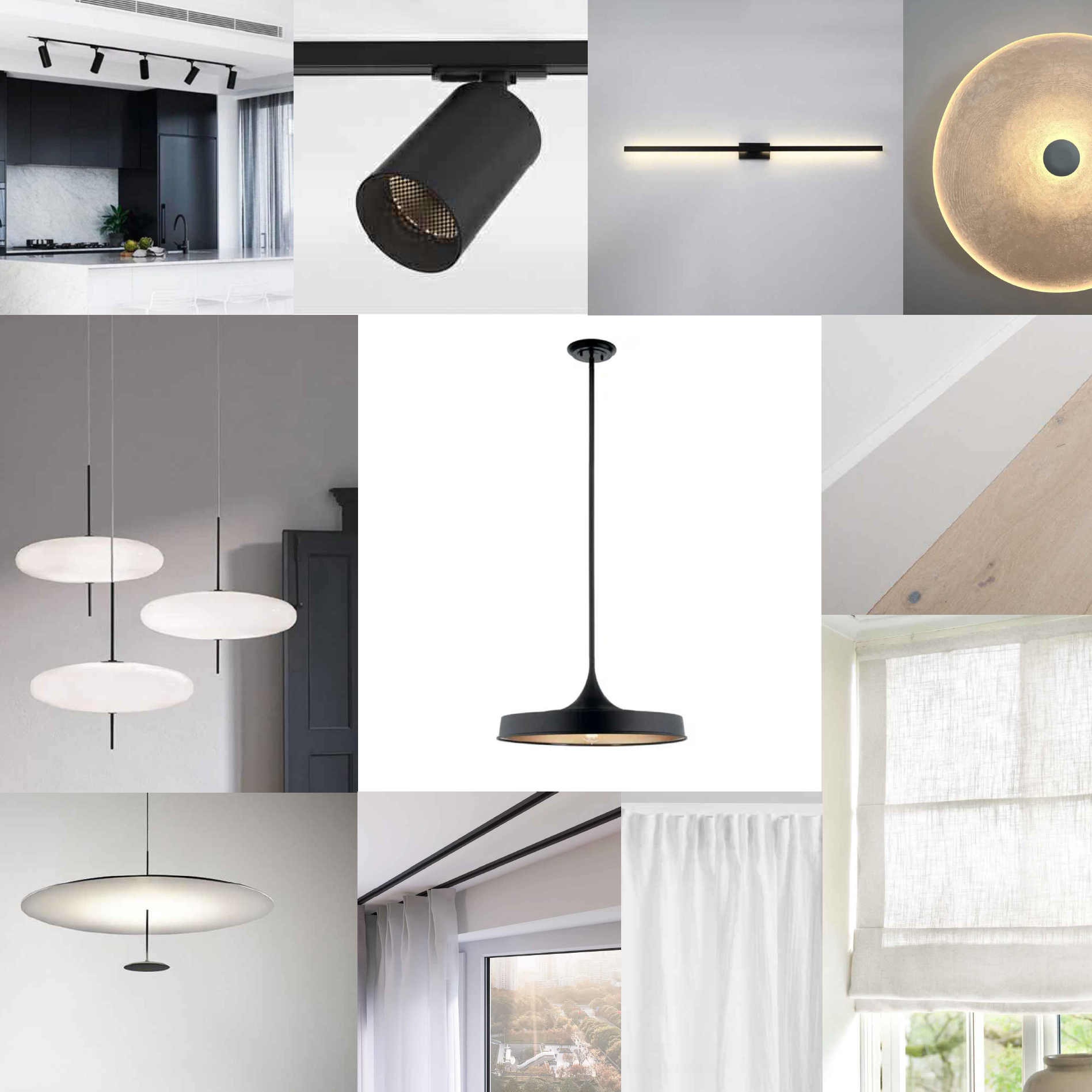 A mood board presenting the lighting design for SG Apartment. The combination of sleek black fixtures and soft, diffused lighting creates a harmonious blend of function and ambiance, complementing the modern interior.
