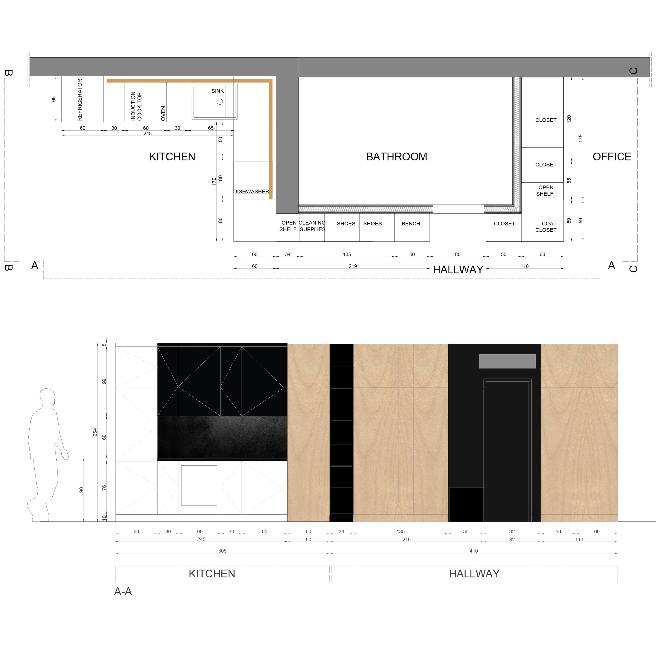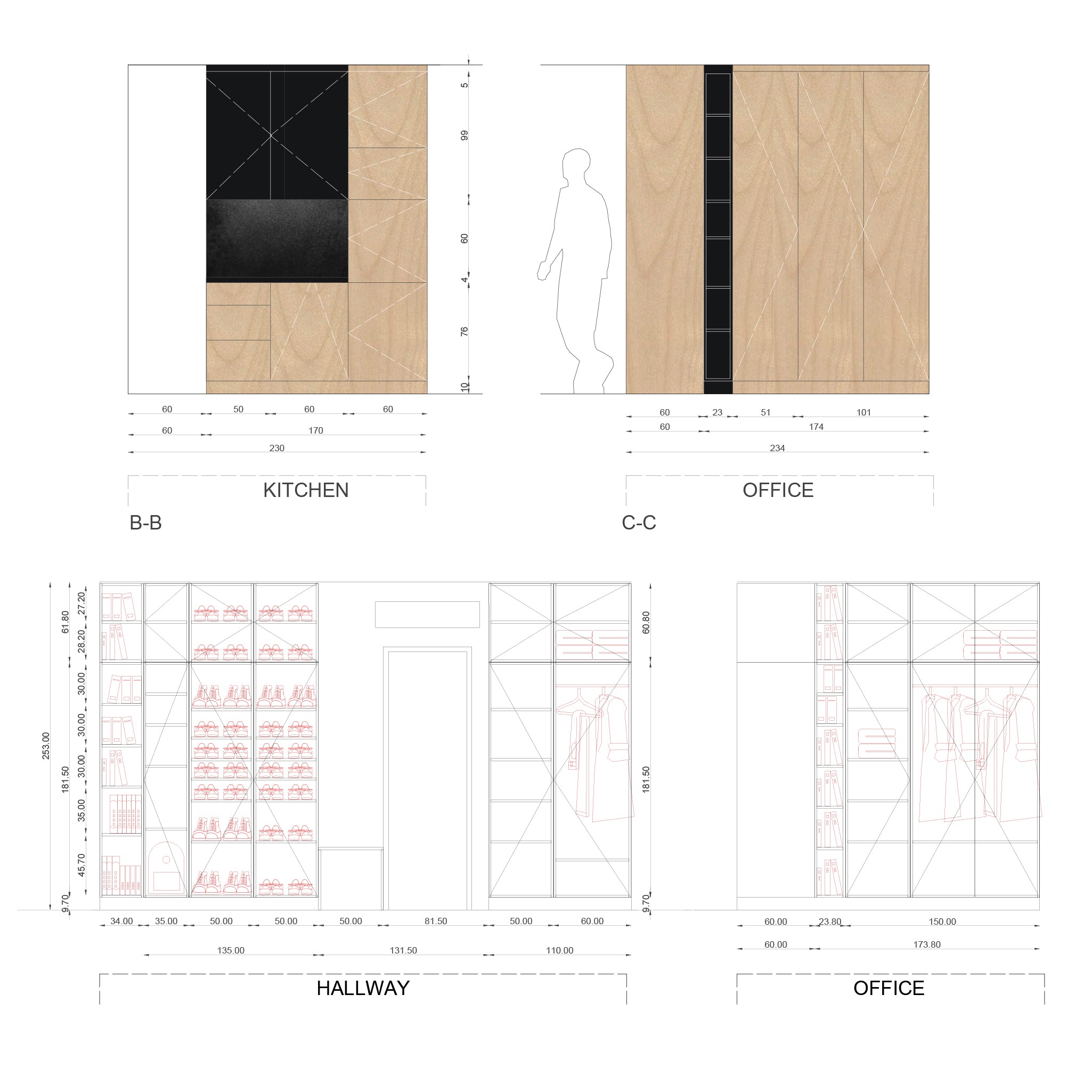 Millwork design drawings. Built-in closets, shelves, and kitchen creating a continuous wrap-around. Natural oak tones complemented with black where the shelves are opened or where the line is cut.