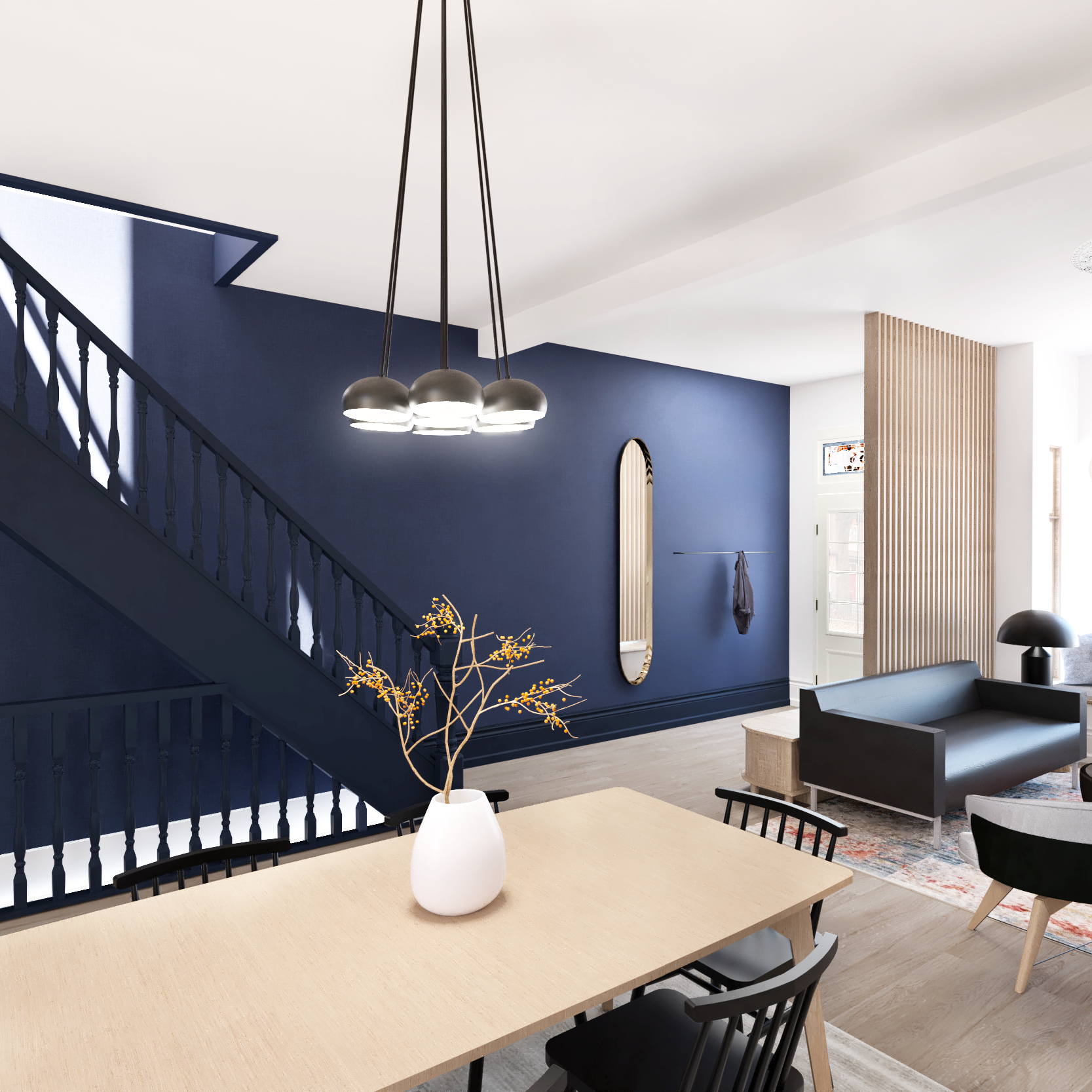 In partnership with Justin Loucks Architecture . Bold blue wall anchors the staircase area, punctuated by modern pendant lighting that cascades down, creating a vibrant contrast. This striking color choice is balanced by minimalistic furniture and decor, presenting a dynamic yet cohesive living space.