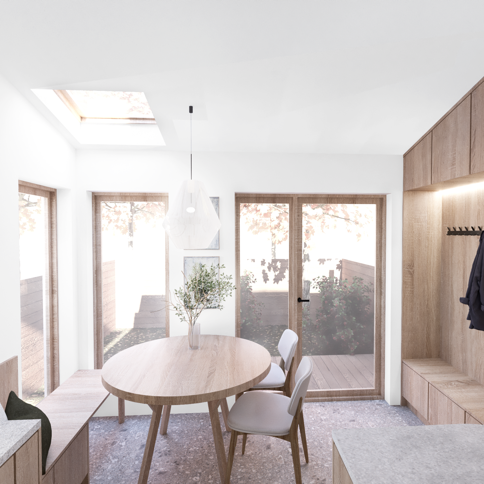 In partnership with Justin Loucks Architecture . A cozy dining nook, illuminated by a skylight and large windows, invites natural light into the space. The combination of soft tones and sleek furnishings creates a serene atmosphere.