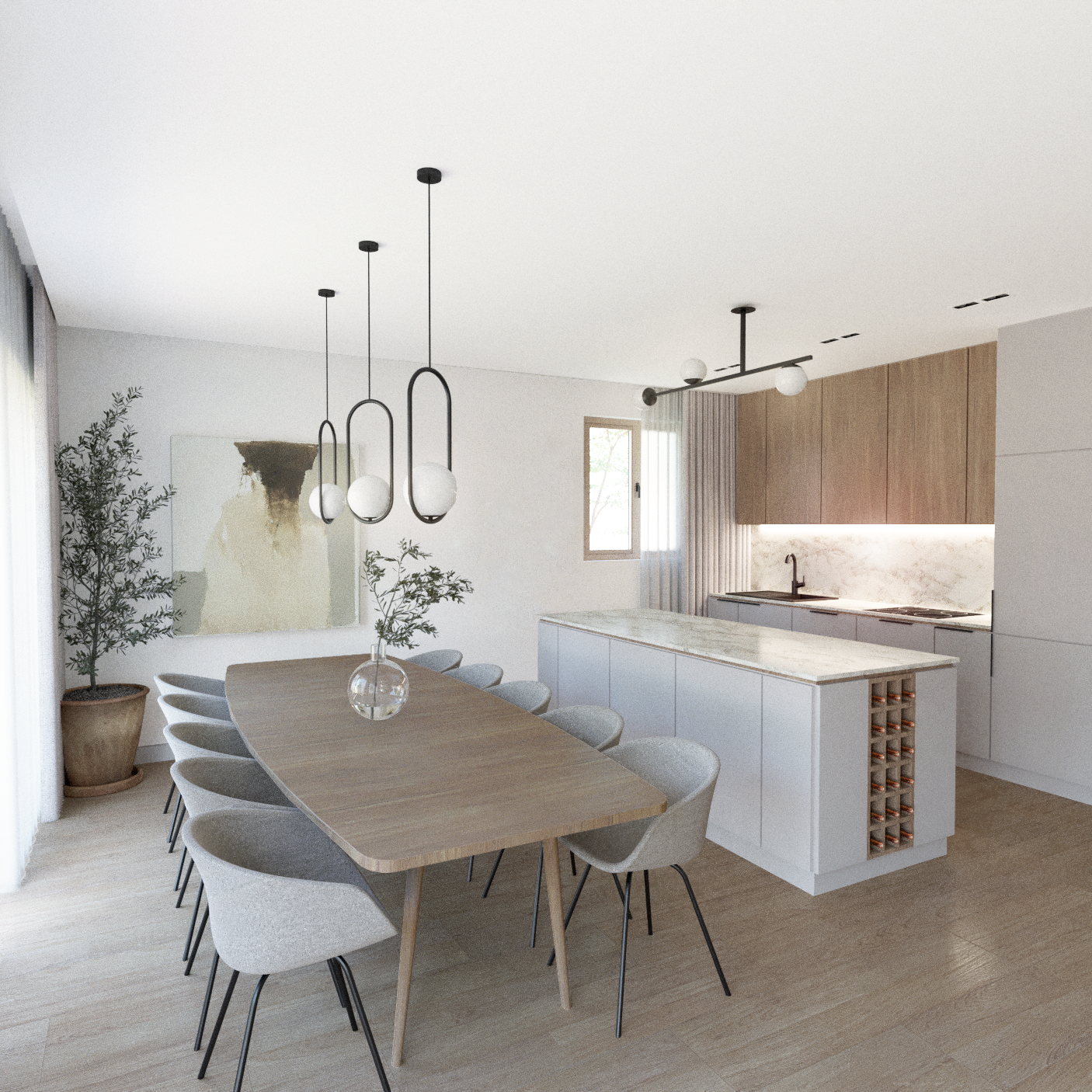 This open-plan dining area is accentuated by pendant lighting and contemporary furniture. The custom kitchen island with integrated wine storage provides a practical and stylish touch.