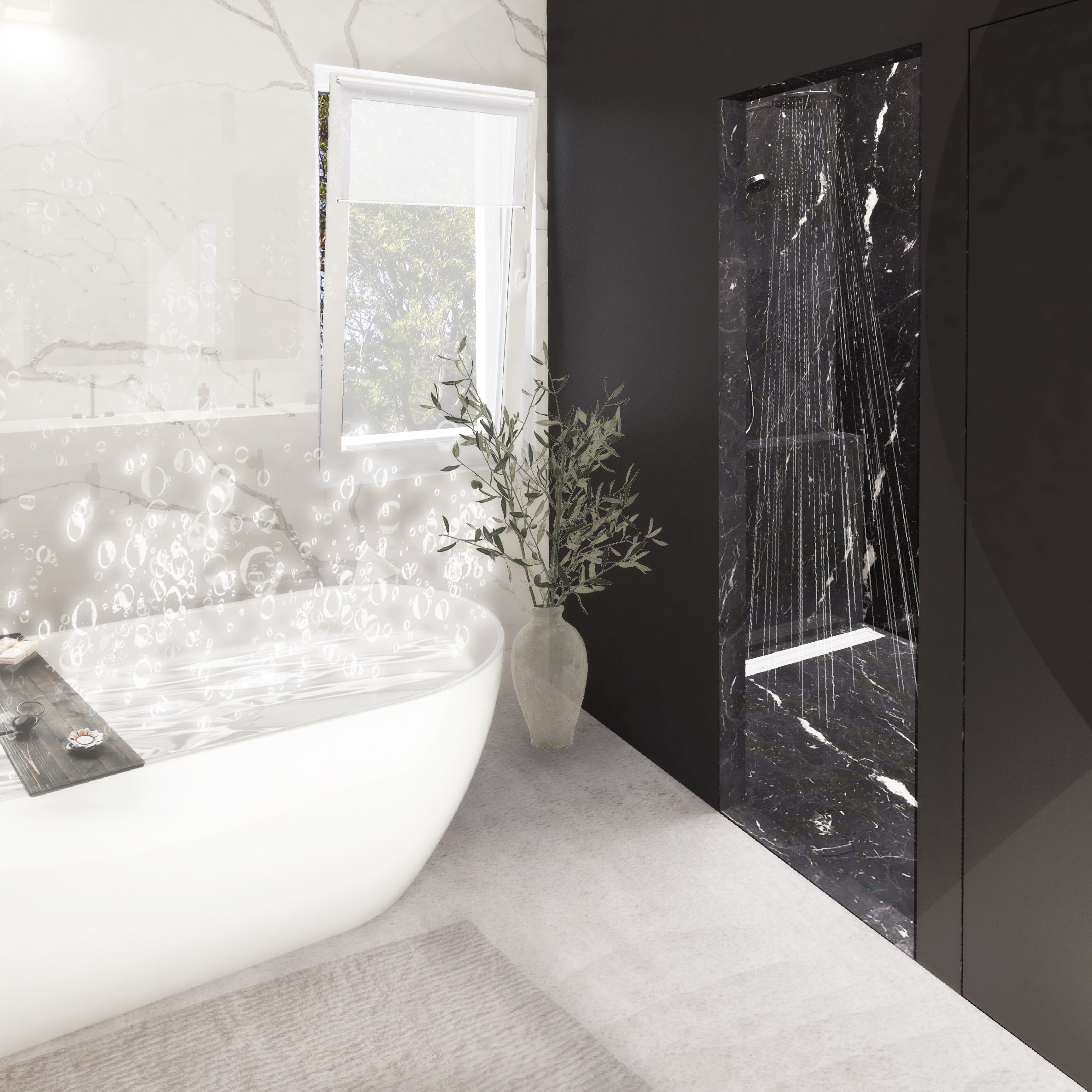 Black and white play in the main bathroom. Black shower and separate WC, and a white area with a large bathtub and vanity.