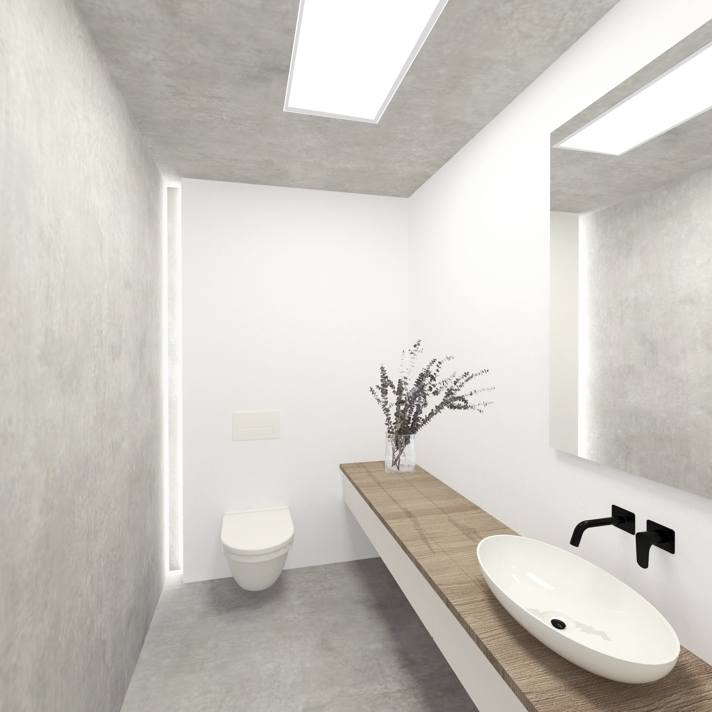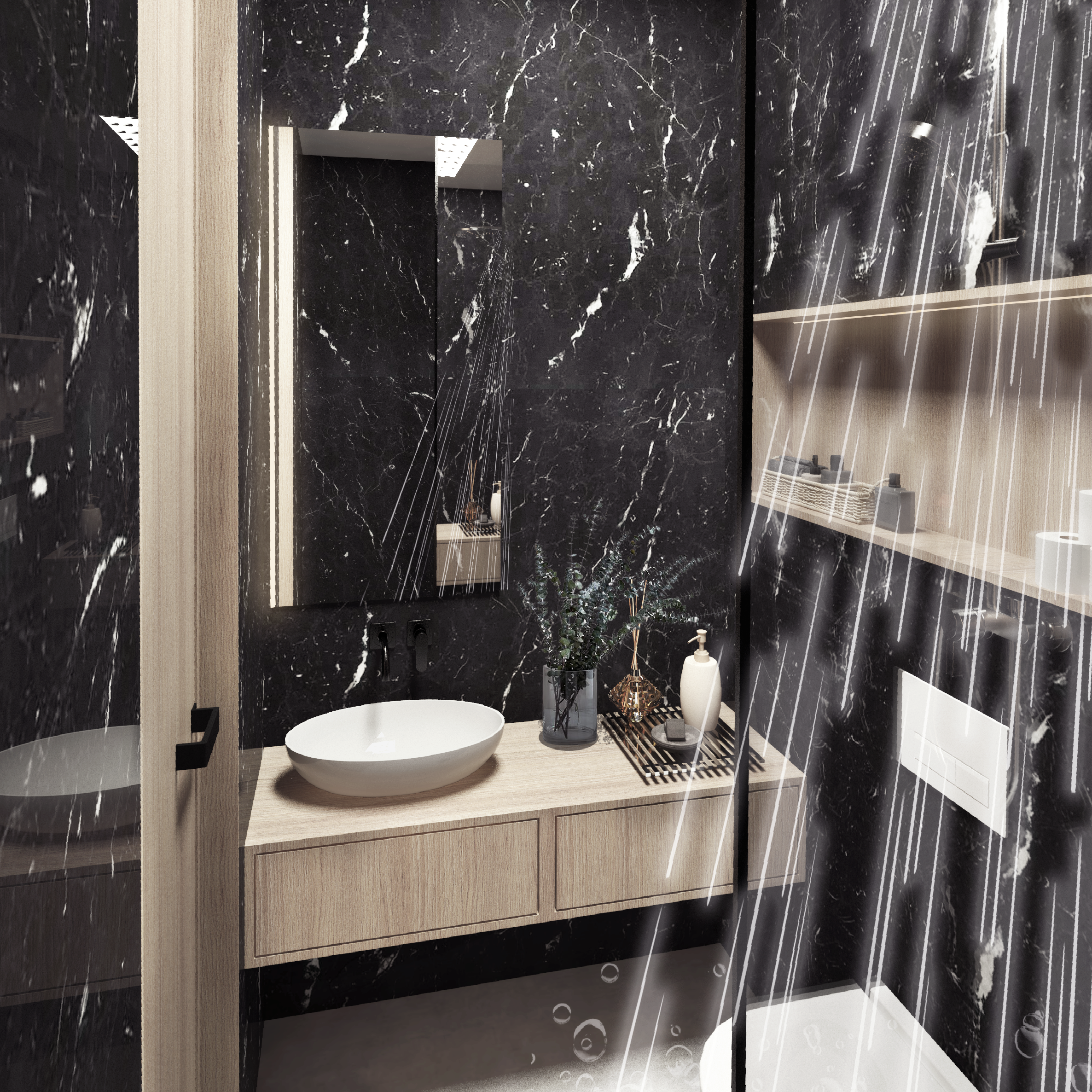 Guest bathroom in The K house. Combining a black marble pattern with light oak wood surfaces and black finishes.