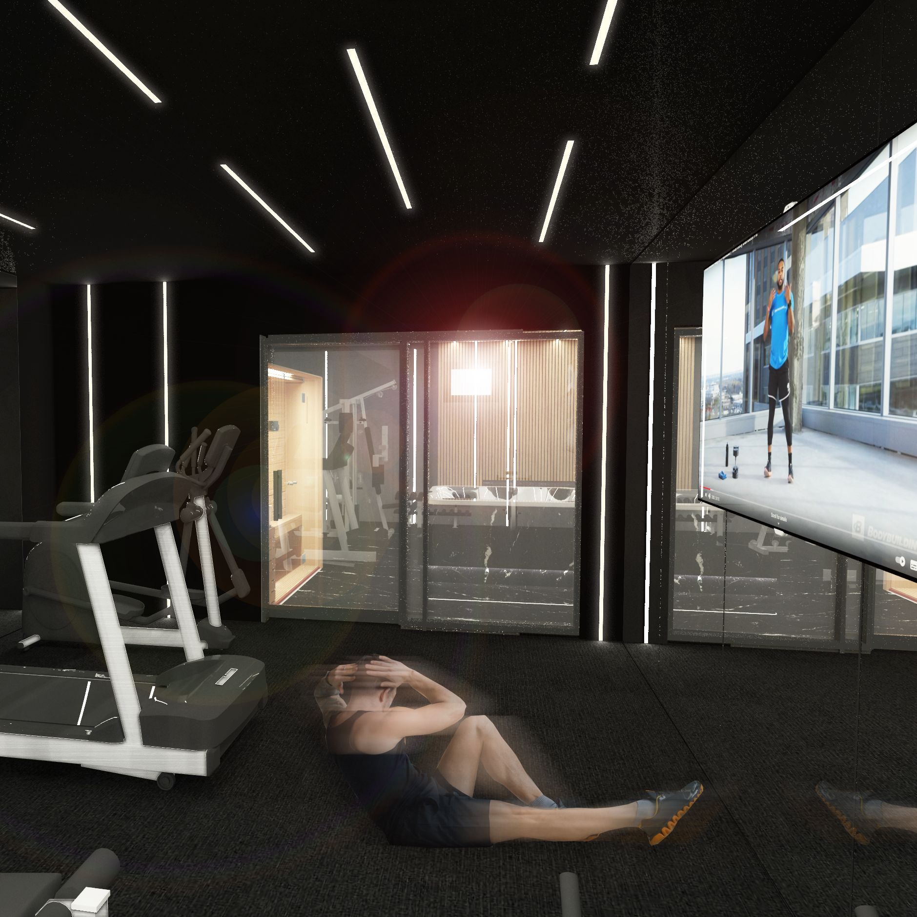 Home gym with direct visual connection to the spa area. Black walls with strip lighting and a full mirror wall; the focus is all on exercise.
