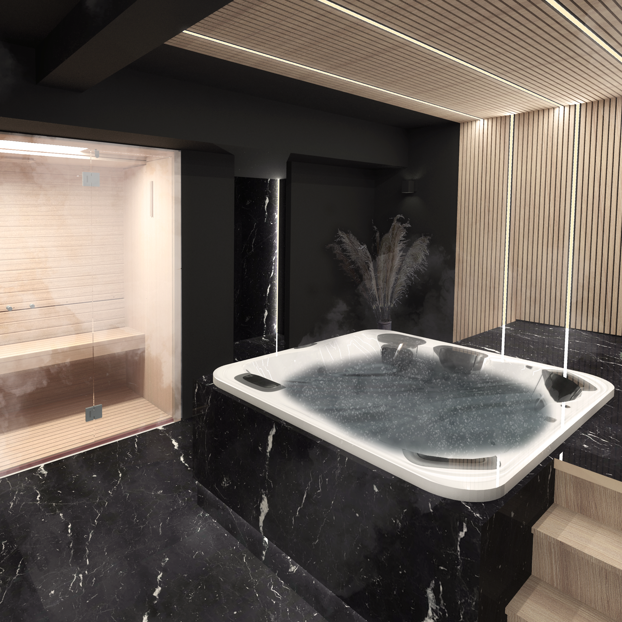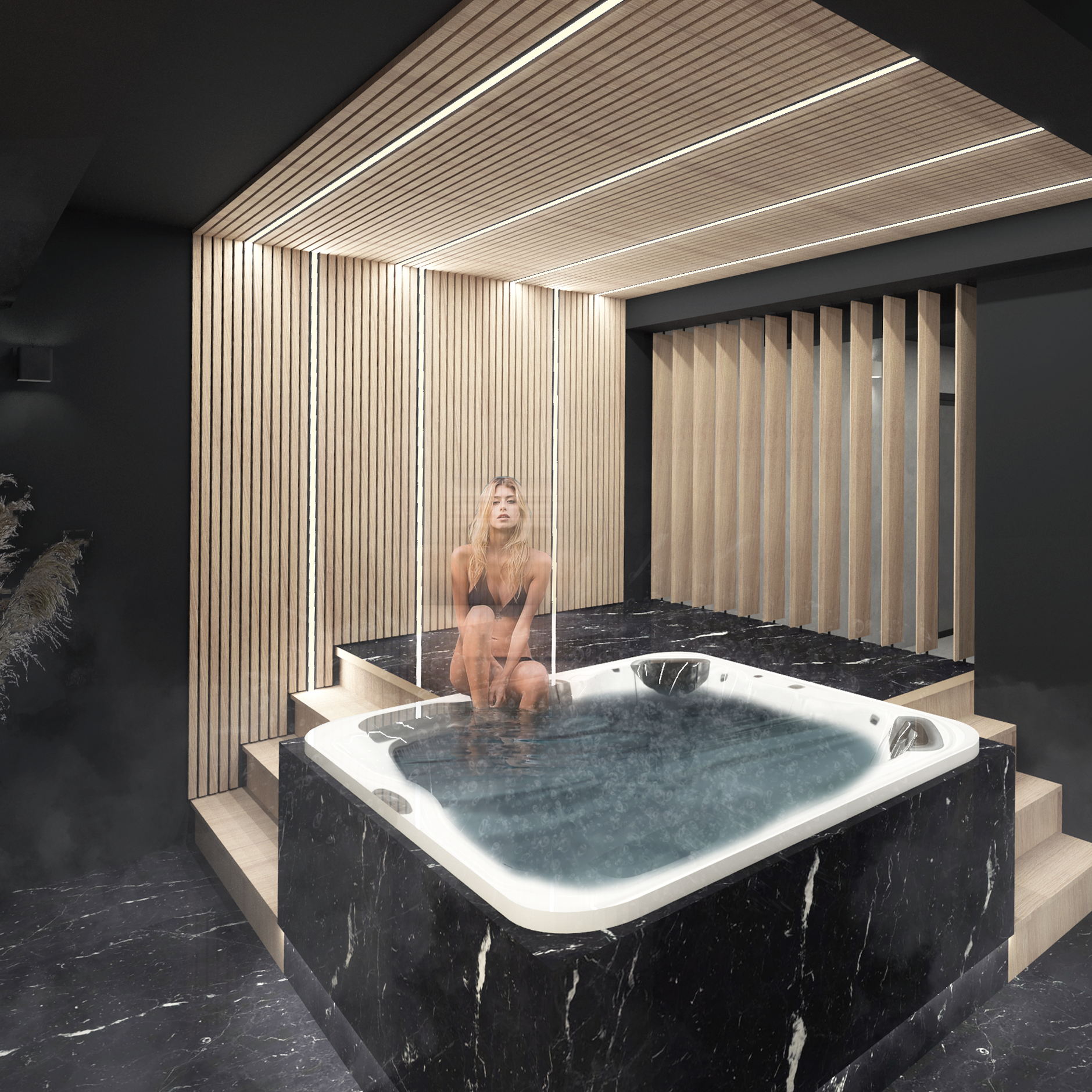 Spa area and relaxing zone with black stone and wood slat details. Hot tub with raised lounging area and permeable rotating slats of wood separating the hallway behind.