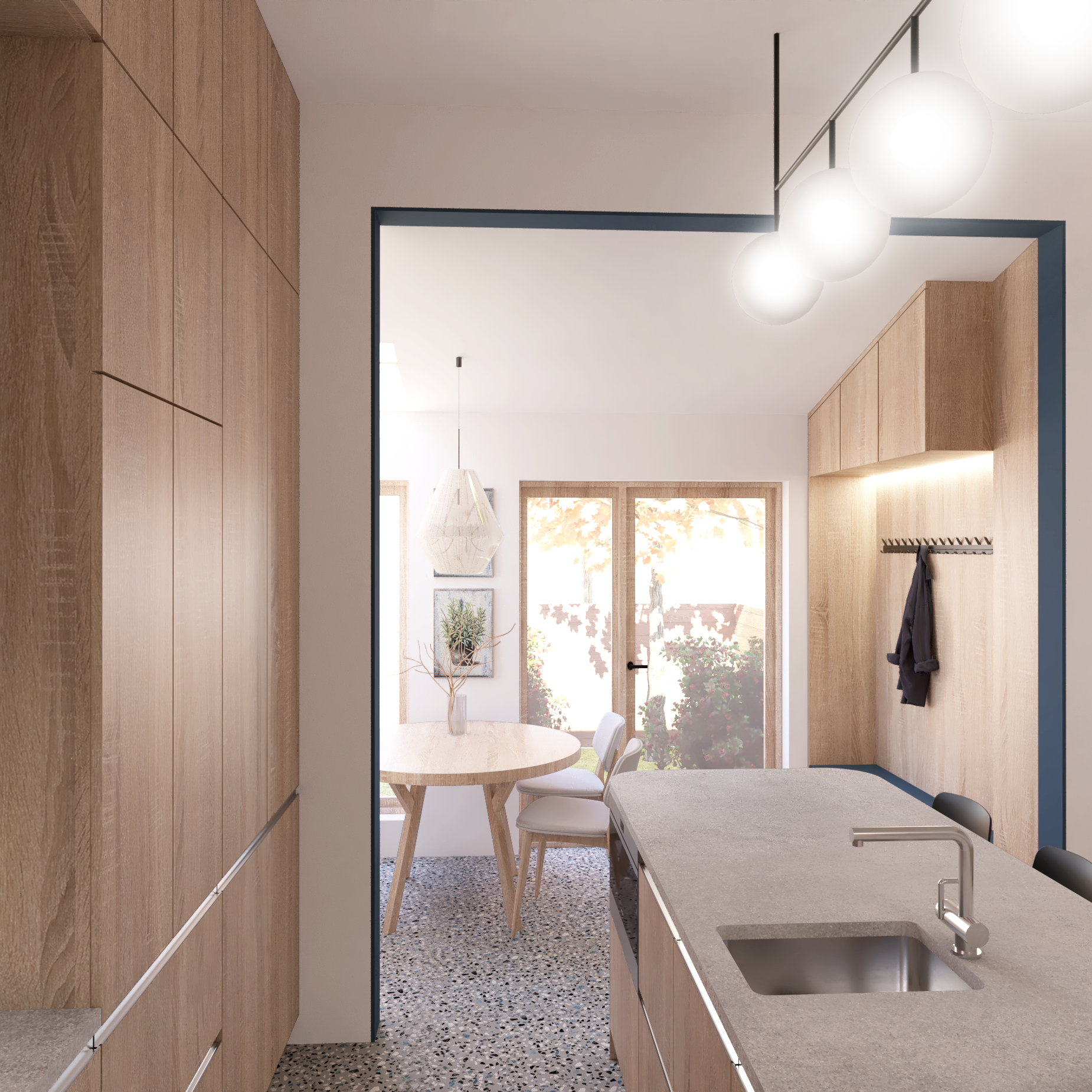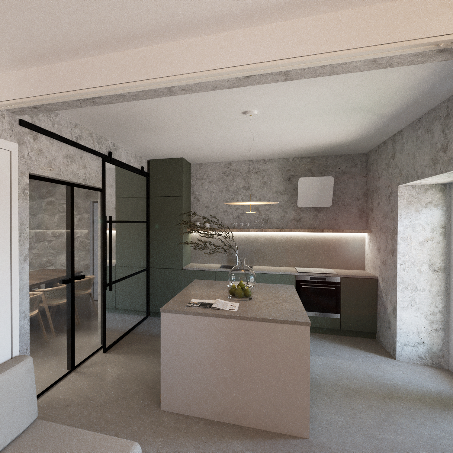 A modern kitchen with soft, muted tones. The space is defined by sleek cabinetry, concrete-like textures, and sliding glass doors that separate the dining area, maintaining an open, airy feel while providing functionality.