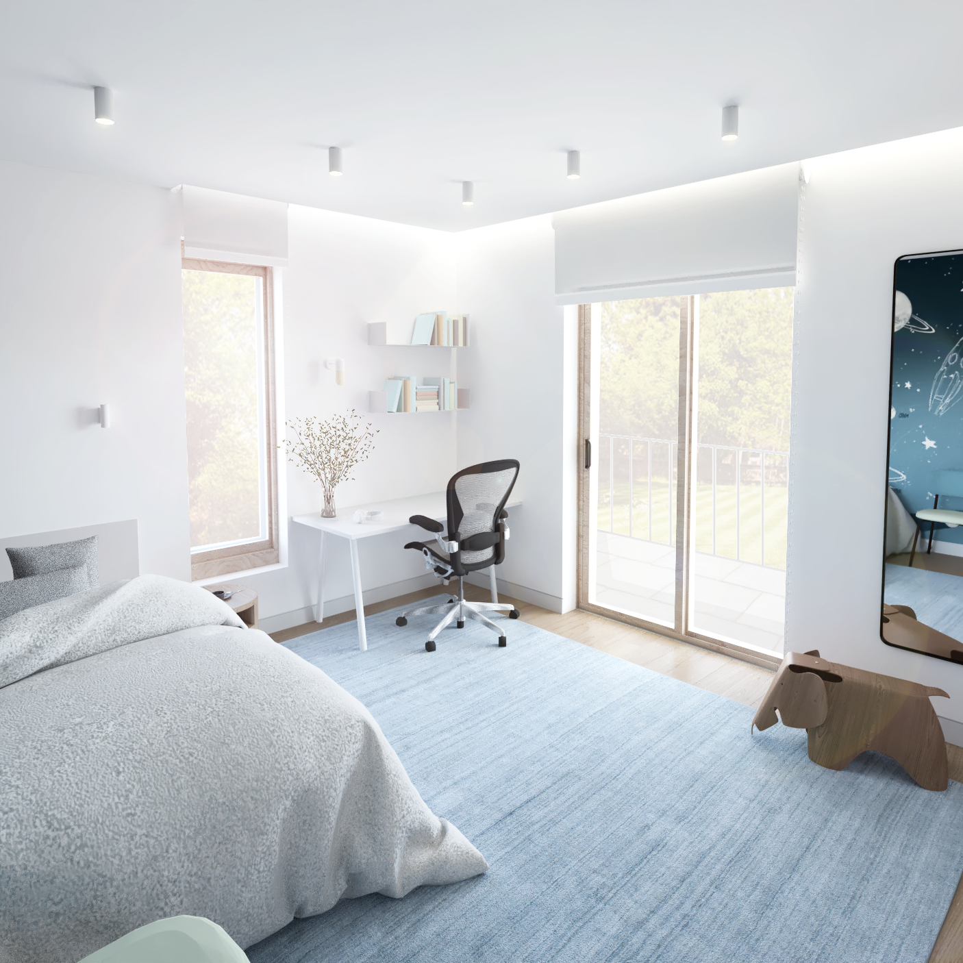 A bright and airy bedroom designed for a young boy. The large windows fill the room with natural light, while soft blue tones in the rug and bedding create a calming environment. Minimalist furniture and built-in shelving add both functionality and style.