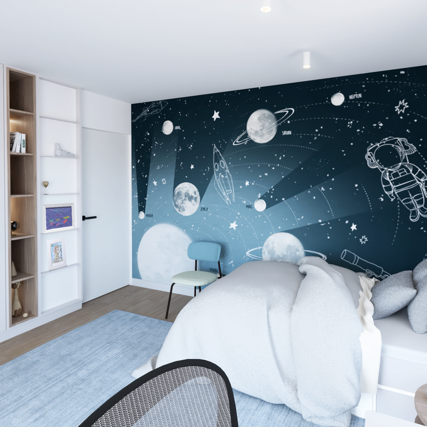 A playful space-themed wallpaper adds a sense of adventure to the boy's bedroom. The dark blue with planets and stars inspires curiosity, while the neutral furnishings and soft textiles balance the room's overall feel, making it both fun and relaxing.