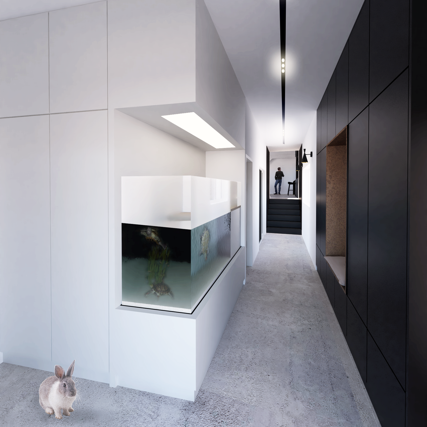 Hallway of this multilevel apartment, for a nature and animal-loving couple, is a simple minimalistic space in black and white. Color is applied only in the sitting nook, copper detail, and warm yellow tones of the lighting.