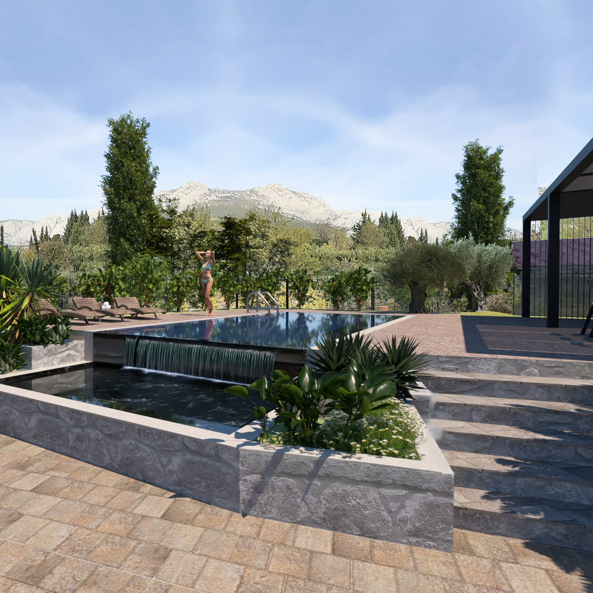The garden has been designed with distinct levels, separating functional areas such as the pool, lounging space, and garden. This creates a natural flow throughout the outdoor space, while allowing each zone to maintain its own unique atmosphere.