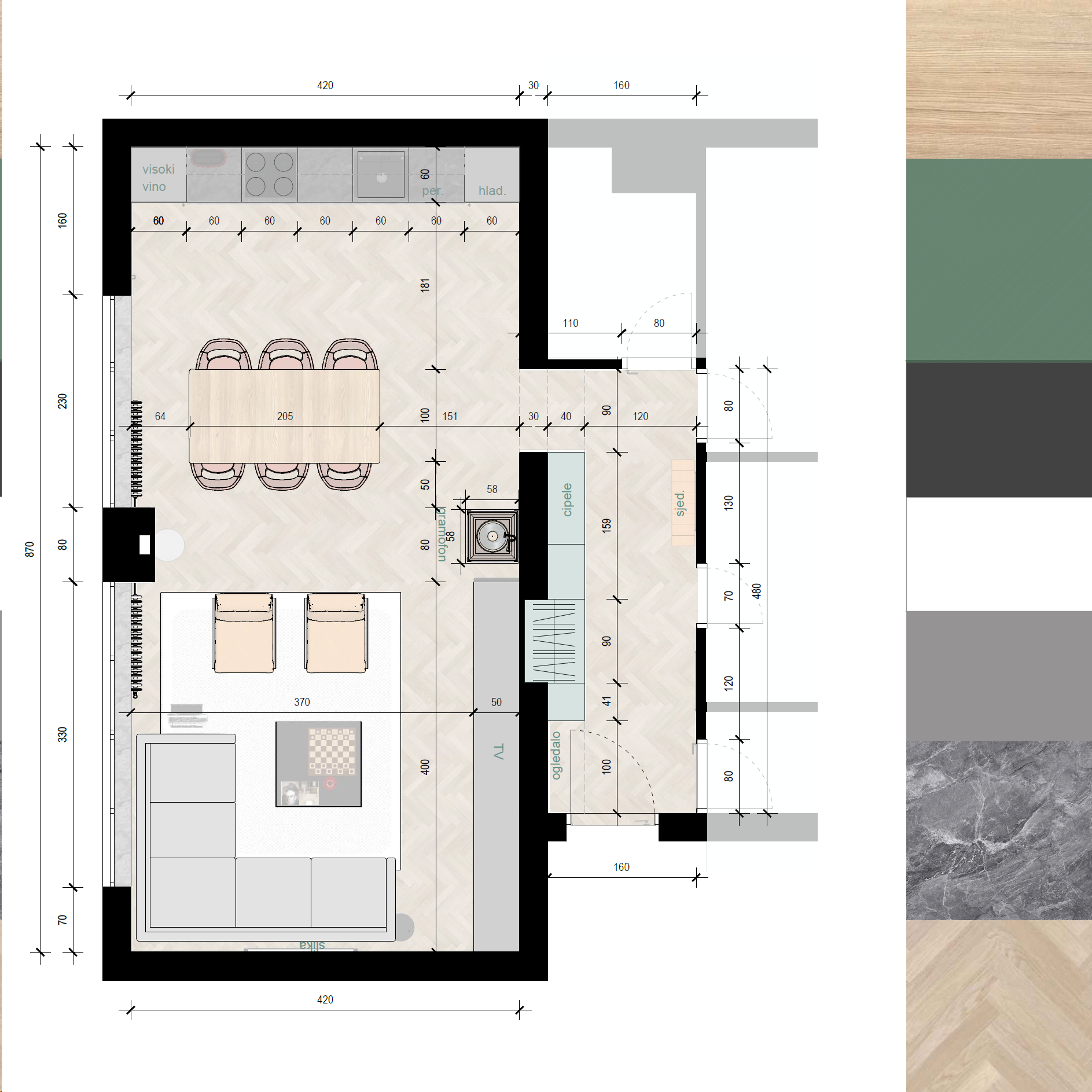 The floor plan showcases the apartment’s open concept design, with a spacious living and dining area connected to a modern kitchen. The color palette features natural wood, green accents, and cool grey tones for a balanced, cohesive look.