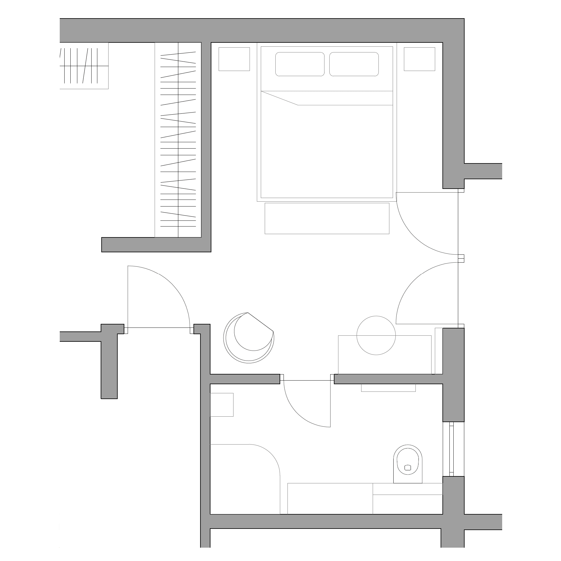 Before and After. This floor plan creates a new transitional space between the bedroom and ensuite, with ample space for storage and a clear flow of movement. The minimalist design ensures comfort without clutter.