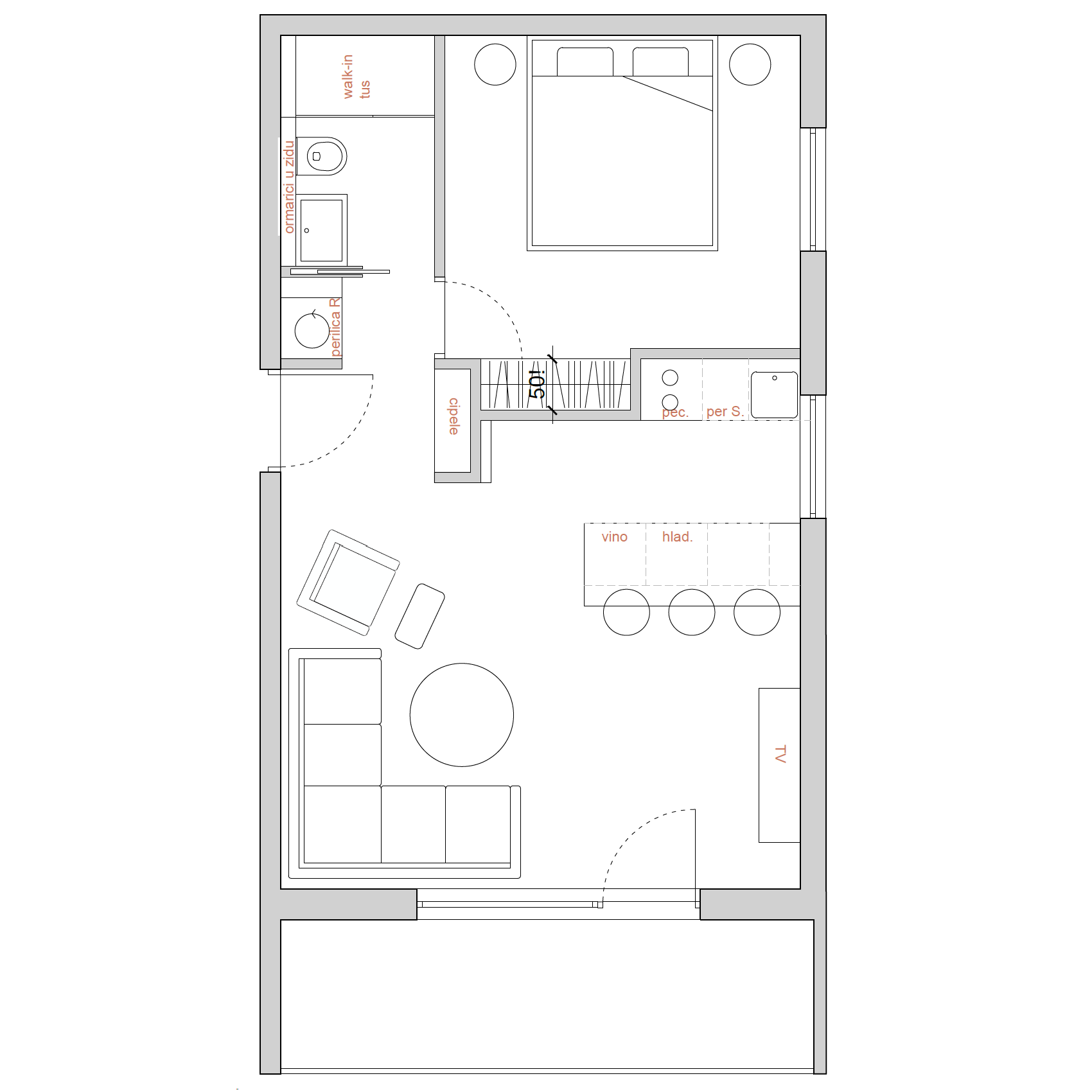 A dynamic layout proposal for Apartment P, featuring various design options: Three different layout options for a young professional's apartment. Exploring the option of maximizing closet space, kitchen and dining.