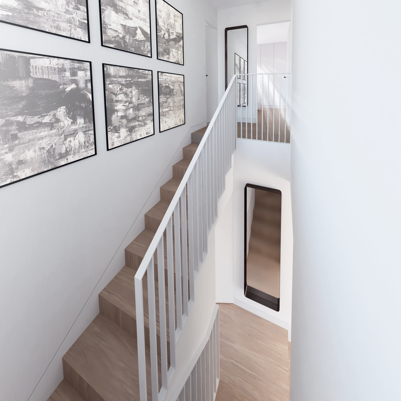 A staircase leads to the upper floor, with minimalist white railings and a gallery of black-and-white artwork on the wall. The design makes use of clean lines and natural light, giving the space an open and modern feel.